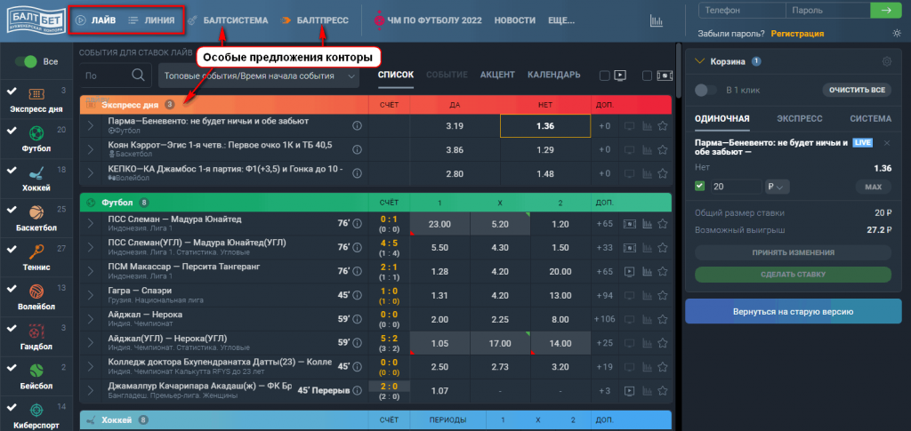 Правила БК «Балтбет» уточняют условия приема live-прогнозов в разделе №11 «Ставки на события по ходу матча». Важные моменты:
