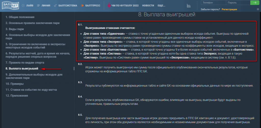 Актуальные условия обслуживания клиентов опубликованы на сайте конторы. Уточнить особенности расчета отдельных дисциплин в БК «Балтбет» можно через раздел «Правила по видам спорта».