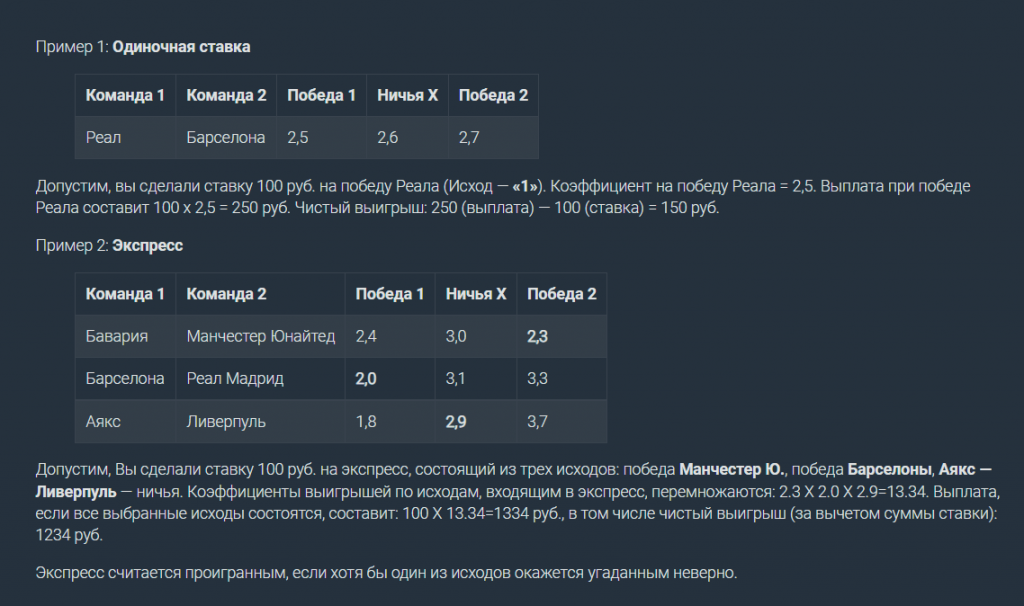 При обработке пари типа «Балтсистема», «Экспресс» и «Система» используют особые правила. Если купон включает больше 1 прогноза, общий коэффициент получают перемножением котировок отдельных ставок.