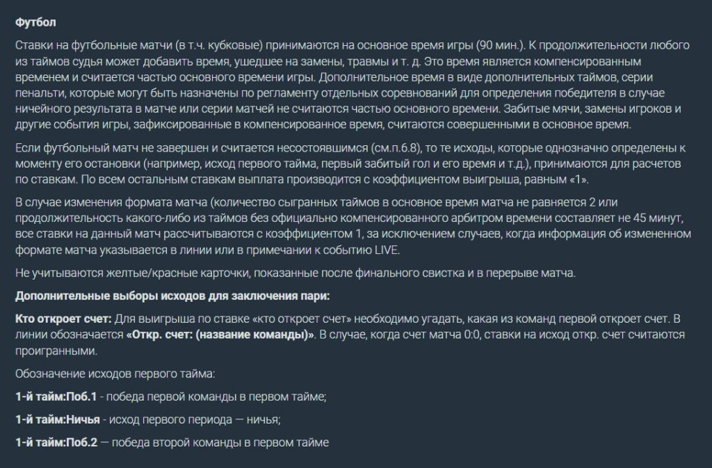Букмекер принимает ставки на основное время. В зачет идет результат 2 таймов по 45 минут, а также компенсированное время. Данное условие относится как к счету матча, так и к футбольной статистике: