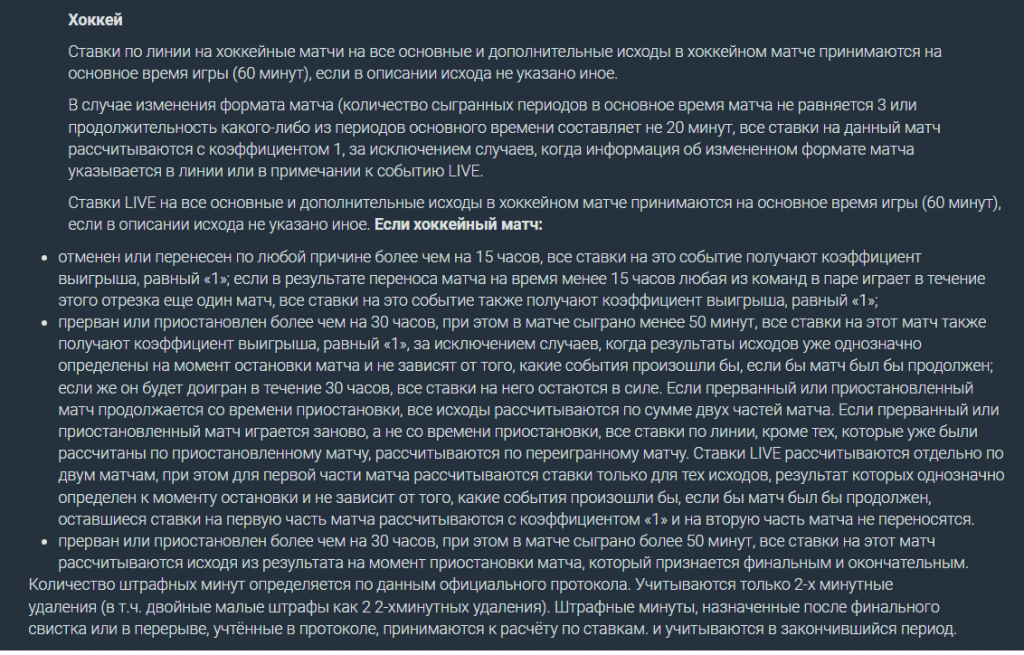 Линия «Балтбет» ориентирована на игровые периоды. Статистика дополнительных таймов и серии буллитов не учитывается. То есть, когда коллективы сыграют со счетом 3:3, контора зафиксирует ничью. Даже если после овертайма результат изменится на 5:3. Аналогичного принципа букмекер придерживается при расчете форы, тоталов и т. д.