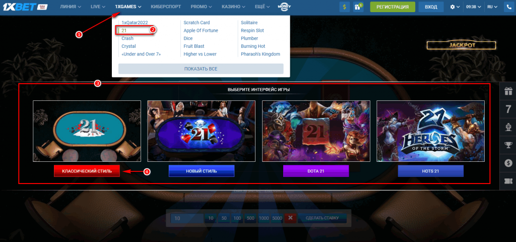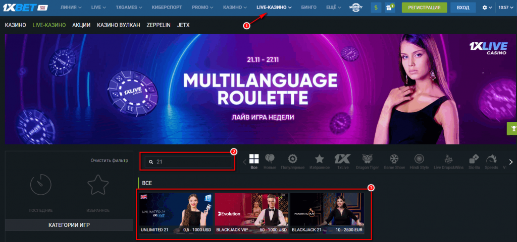 Заходим на официальный сайт букмекера. При наведении курсора на раздел «1 xGames» откроется меню со списком популярных игр. Нажимаем на вариант «21».