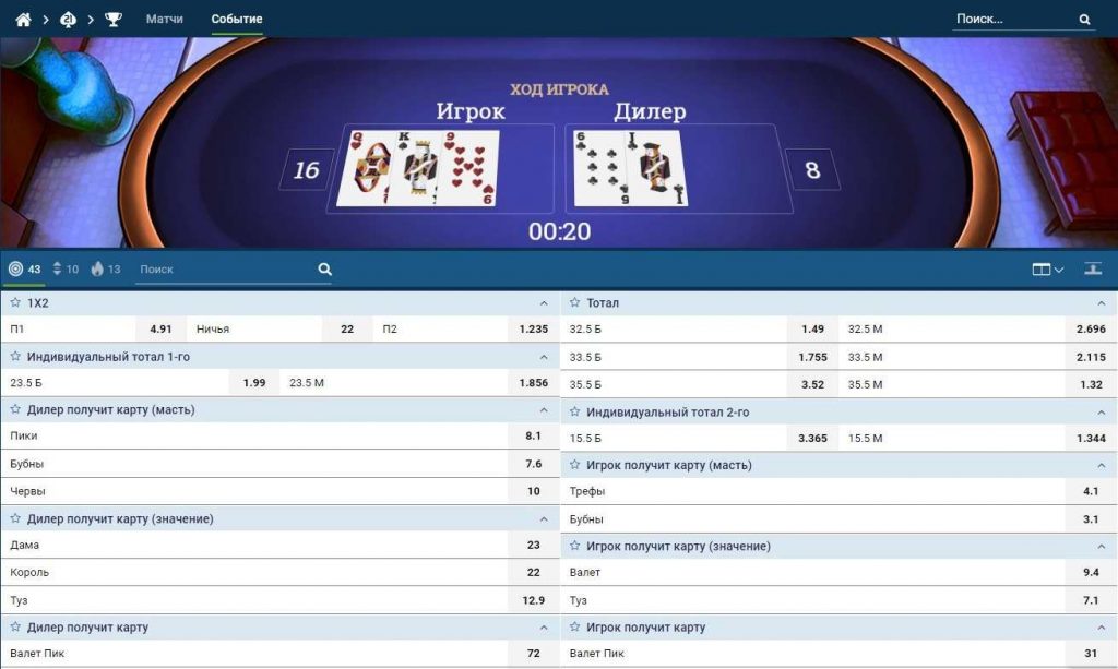 Карточная игра «21 очко» в БК 1xBet пользуется большой популярностью. Смысл в том, чтобы набрать ровно 21 балл или максимально приблизиться к этому значению. Причем игроки могут ставить не только на свою победу, но и на масть или тотал.