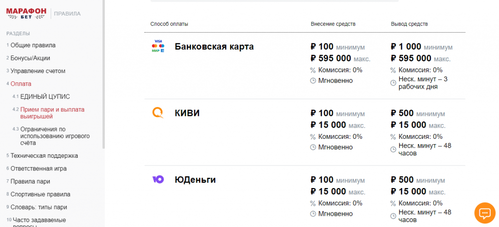 Максимальные и минимальные суммы ввода и вывода денег определяются выбранным способом пополнения счета. Подробная информация об этом есть в пункте 4.2 раздела «Оплата» Правил «Марафонбет».