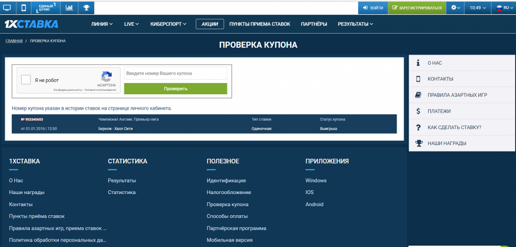 По завершению проверки билета посетителю виртуальной букмекерской конторы становится доступна следующая информация:
