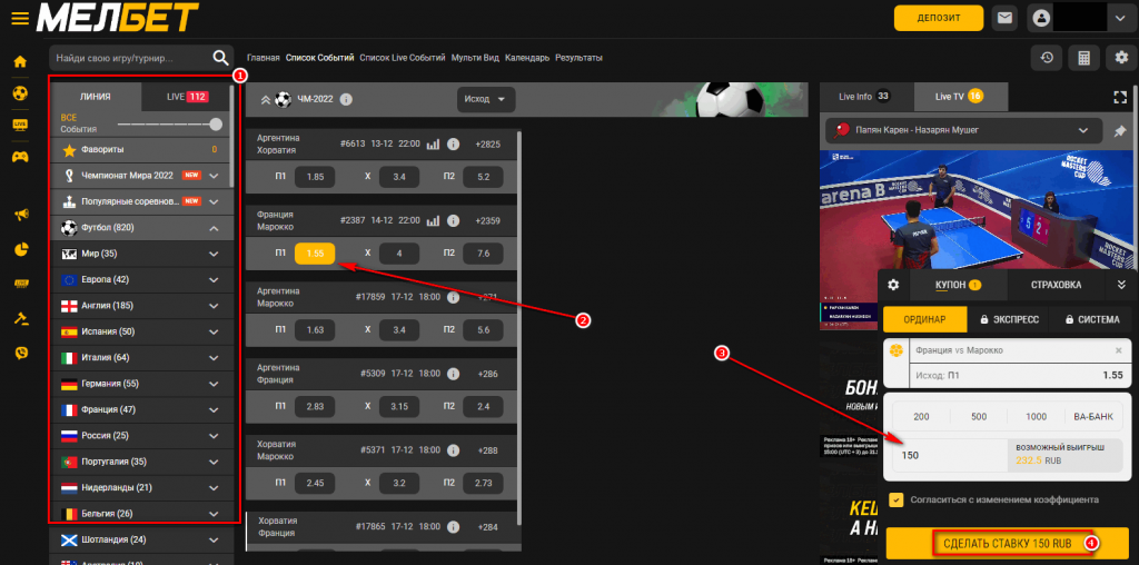 Пари можно найти в разделах «Линия» или «Лайв». Пользователю следует выбрать матч, а потом кликнуть по коэффициенту. В нижнем правом углу откроется окно «Купон», где останется указать сумму и подтвердить действие.