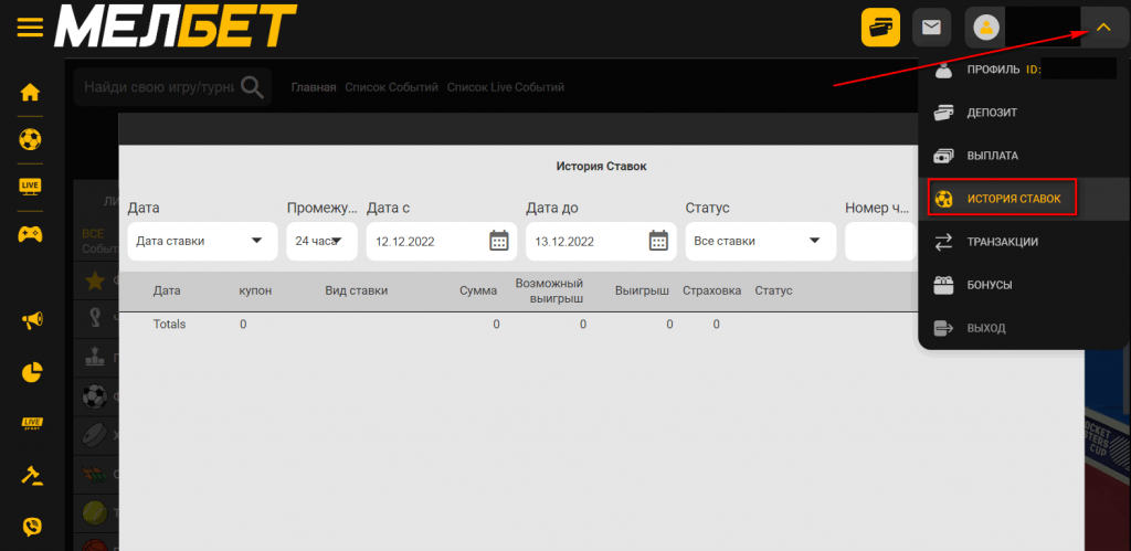 - Открыть раздел «Ставки» и перейти на страницу «История».