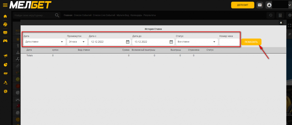 Проверка купона БК Melbet происходит так же, как и на основном портале. Игроку достаточно авторизоваться, зайти в историю и настроить фильтр.