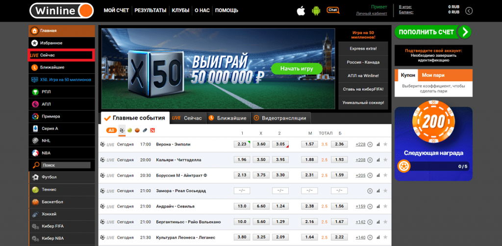 После перехода в Winline вы можете ознакомиться со списком доступных событий. В центре располагаются 4 раздела: