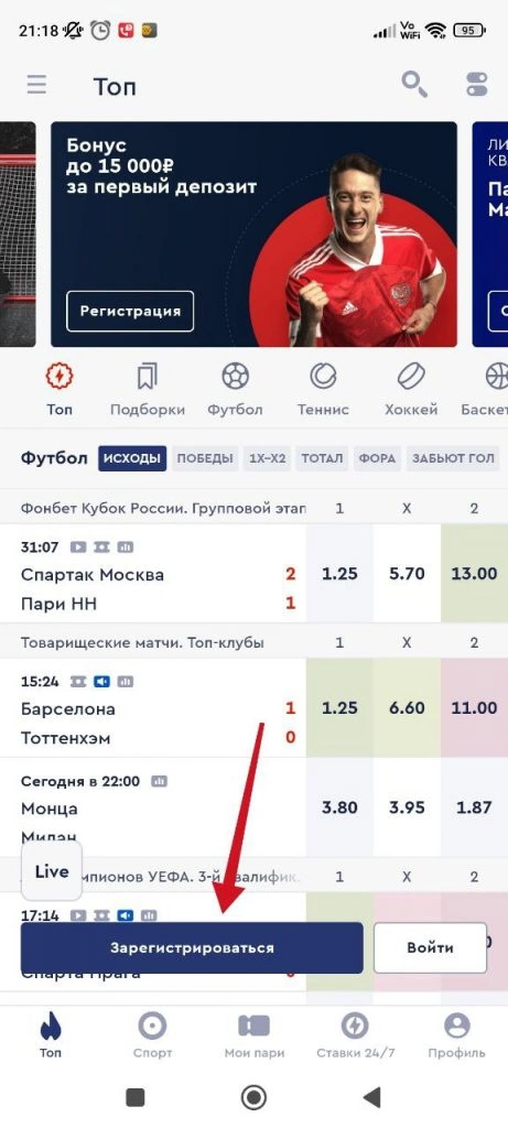 Регистрация в «Фонбет» через мобильное приложение