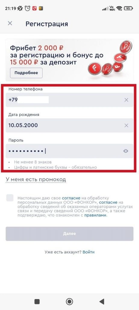 В регистрационные поля нужно ввести номер телефона и электронную почту и дату рождения. Потом придумываем пароль для авторизации, активируем промокод и жмем «Далее».