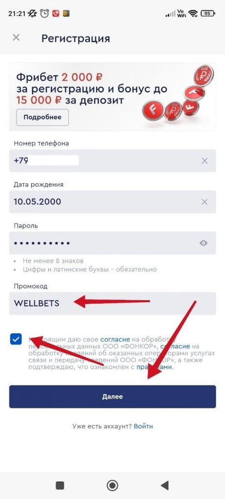 При запуске кнопка «Зарегистрироваться» появится внизу экрана. Жмем на нее и вводим данные, которые необходимы букмекеру. Обязательно ставим галочку напротив согласия с условиями, прежде чем кликнуть «Далее».