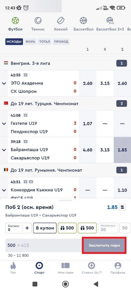 - Оформляем купон. В окошке справа нужно указать сумму и подтвердить операцию кнопкой «Заключить пари на…».