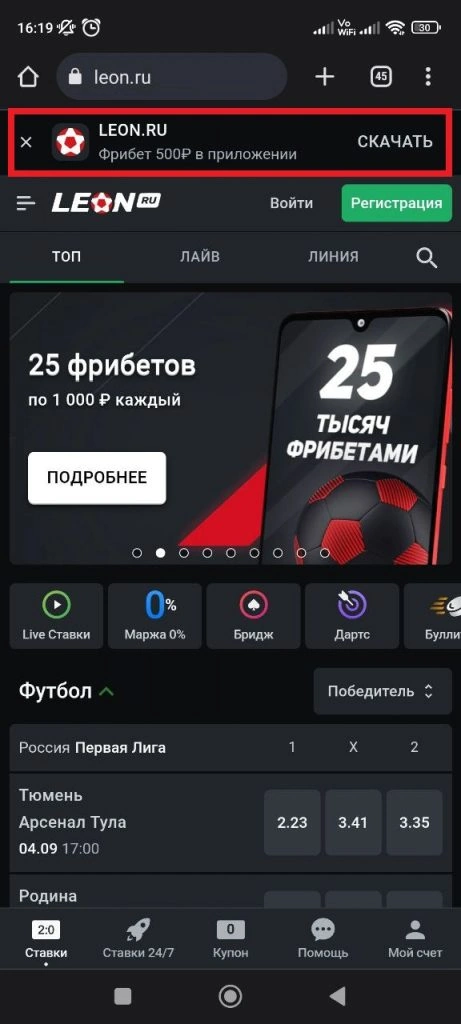 Новым клиентам доступна акция, в рамках которой они могут получить до 25 бесплатных ставок номиналом 1 000. За авторизацию в приложении для iOS/андроид контора Leon дарит сумму депозита — 500 рублей.