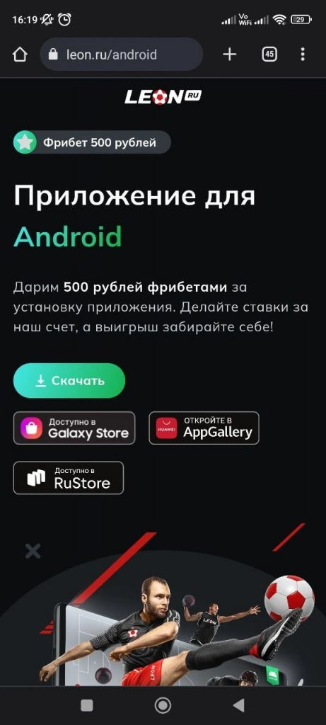 Загрузить программу для Android можно напрямую через leon.ru или через официальный сайт букмекерской конторы. Файл APK также можно найти в магазинах контента AppGallery, Galaxy и Ru Store. А если у вас айфон, скачать ПО можно через AppStore.