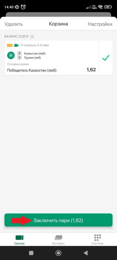 Для оформления экспресса нужно минимум 2 прогноза. Систему можно создать, добавив в «Корзину» больше 3 событий.