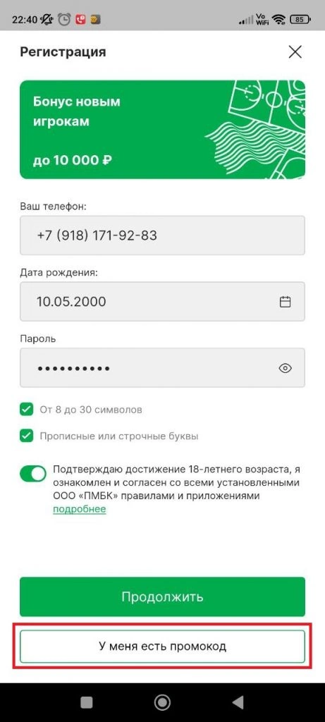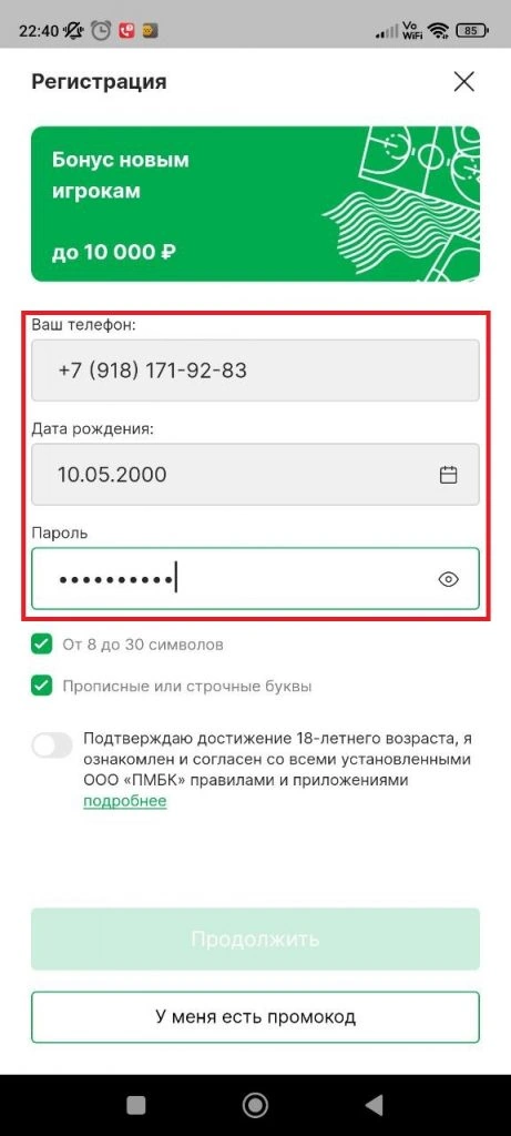 В регистрационной форме указываем номер телефона, дату рождения и электронный адрес. На этой же странице придумываем пароль и вводим промокод. После нужно подтвердить согласие с правилами и нажать «Зарегистрироваться».