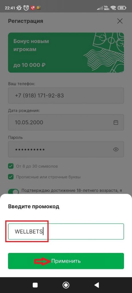 В форме необходимо указать мобильный номер, дату рождения и электронный адрес. Придумайте пароль и введите промокод. Подтверждаем возраст и жмем «Зарегистрироваться». Аккаунт будет создан после проверки номера через СМС.