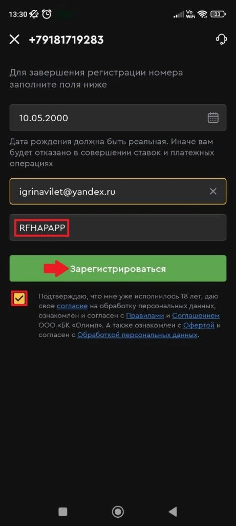 В окне следует указать российский номер телефона, дату рождения e-mail и пароль. При наличии бонус-кода жмем «У меня есть промо» и вводим комбинацию в появившееся поле.
