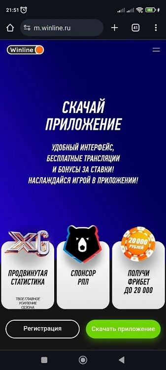 При открытии вебсайта букмекера через браузер смартфона или через десктопную версию — БК Winline предложит скачать и зарегистрироваться в мобильной версии. Далее расскажем подробную инструкцию данного метода.