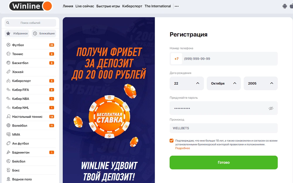 Winline предлагает современный сайт с программой для смартфонов. Так что зарегистрироваться на «Винлайн» можно как с ноутбука, так и через смартфон. Процедура простая и занимает не больше 5 минут. После этого вы можете начинать свой беттинг.