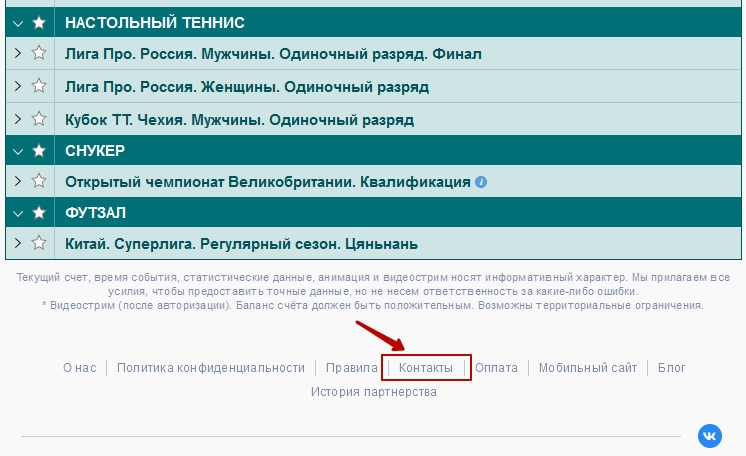 На этой странице официального ресурса конторы указаны все возможные методы связи. Бетторы могут выбрать один из них и направить свой запрос. Чтобы найти ссылку на контакты, нужно зайти на главную страницу сайта и пролистать ее вниз до подвала.