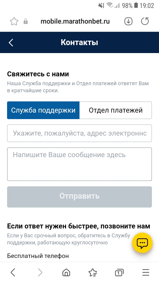 Если срочно нужно решить какую-то проблему, связанную с использованием сервиса этого букмекера, можно обратиться по телефону «Марафона», указанному в разделе контактов. Техподдержка общается с бетторами по горячей линии только на русском языке. Есть возможность звонить из разных стран. Ждать ответа при этом способе связи с саппортом приходится буквально несколько минут.