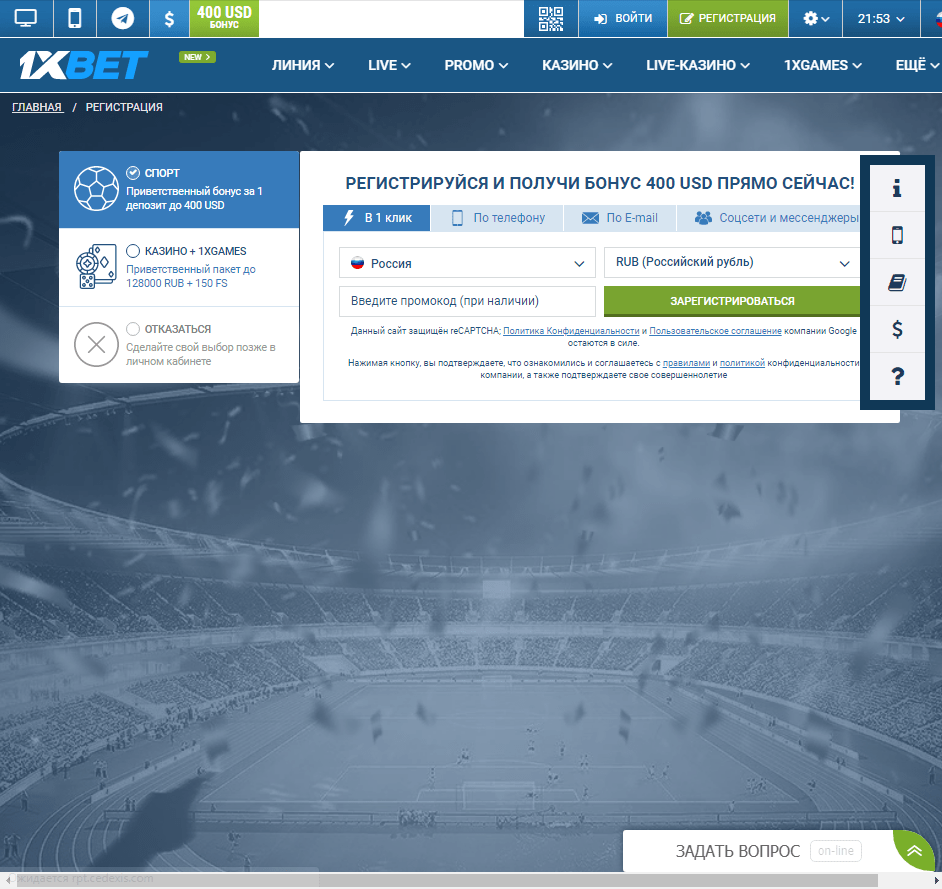Букмекерская контора 1Xbet имеет лицензию Кюрасао, но в России ведет нелегальную деятельность. Но компания популярна в странах СНГ и РФ благодаря мощной рекламе и хорошей бонусной программе. Для регистрации достаточно указать ФИО, контакты и валюту счета.