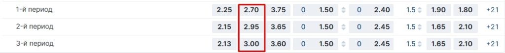 Конкретного алгоритма по выбору наилучшего момента для ставки по ходу матча не существует. Все зависит от происходящих на льду событий. Чтобы максимизировать прибыль от заключаемых пари в режиме лайв внимательно следи за ходом поединка с помощью трансляции.