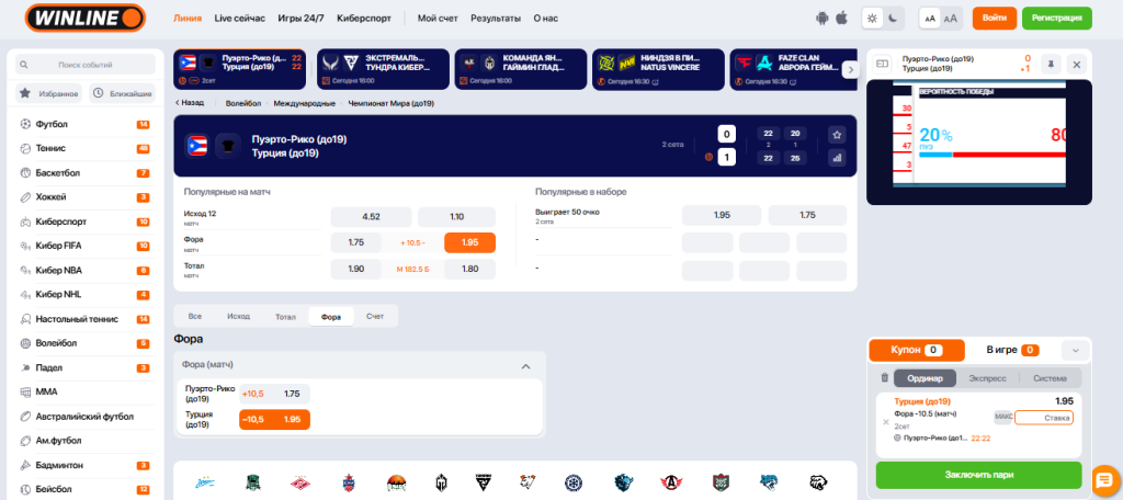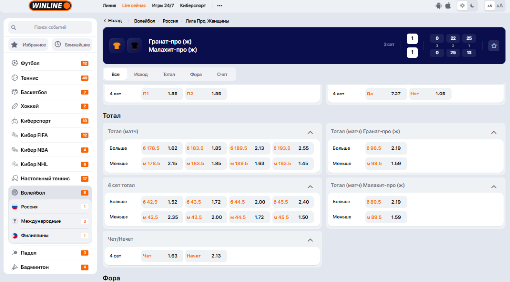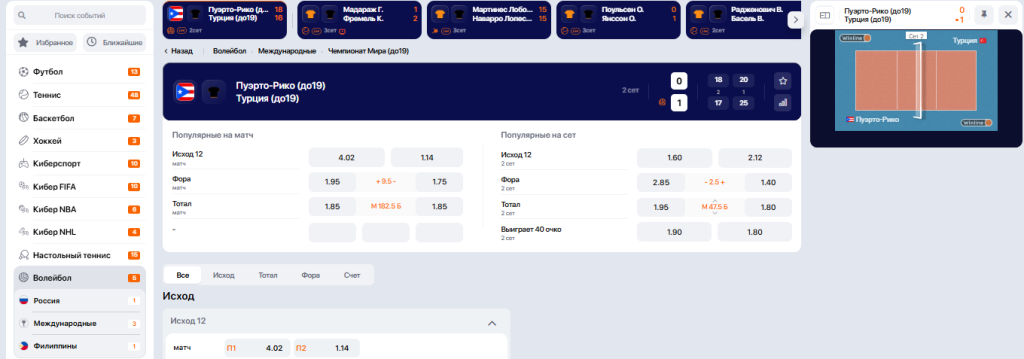 Теперь пошагово рассмотрим, как оформлять пари на результаты волейбольных матчей в лайв-режиме.