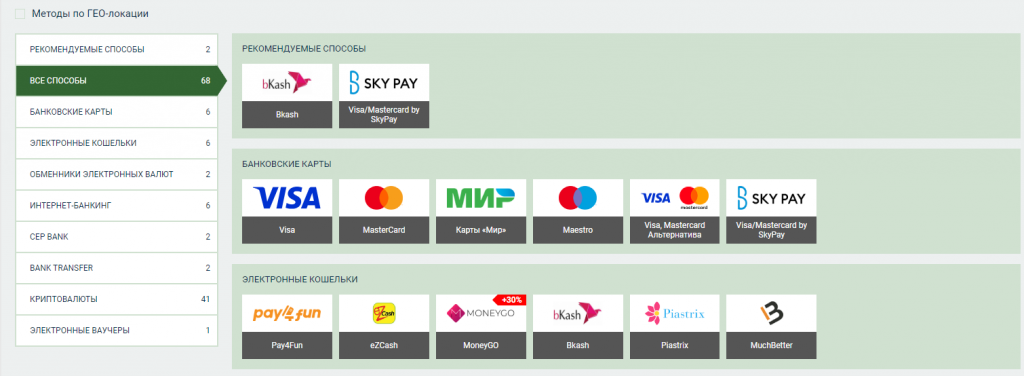 - Платежные системы. 1xBet предлагает своим игрокам более широкий спектр платежных систем — 91. Это карты, криптовалюты, электронные кошельки и ваучеры. Melbet предлагает такие же способы ввода и вывода денег, но их количество меньше — 68.
