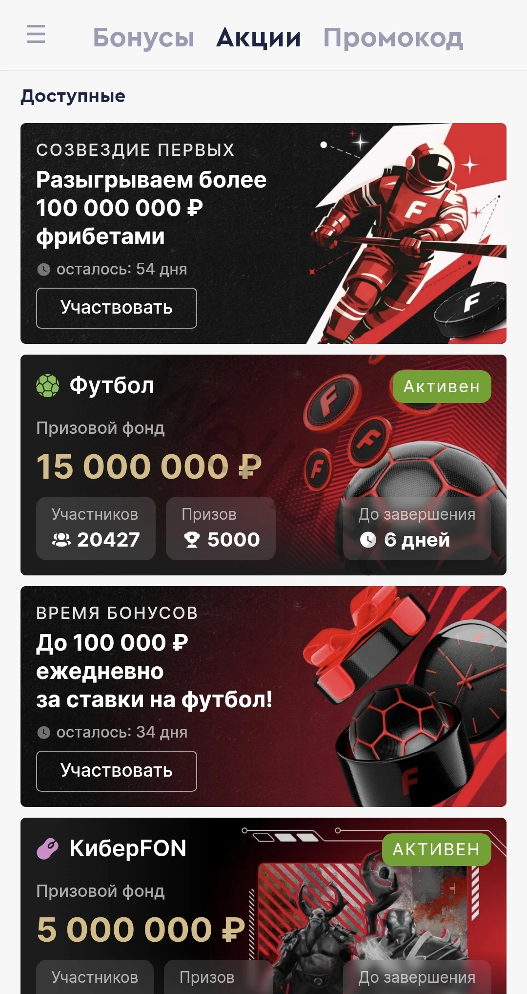- «Кешбэк» — Фонбет делится фрибетами до 15%.