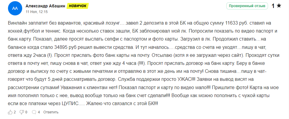 Вторая распространенная претензия к «Винлайну» — порезка максимумов. Если игрок выходит в плюс, то букмекер может снизить максимальный размер ставки до 300 рублей. Букмекер оставляет за собой право устанавливать максимумы индивидуально для каждого беттора без объяснения причин.