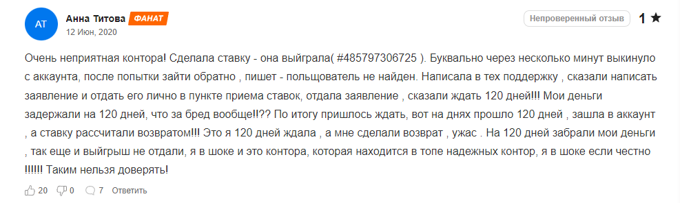 К «Лиге Ставок» предъявляют претензии другого характера. Букмекер может рассчитать выигрышные ставки с коэффициентом 1 без объяснения причин. Больше всего возмущения на форумах и агрегаторах вызывает заморозка счета на 120 дней. Нечастая практика, но она заставляет многих беттеров нервничать.