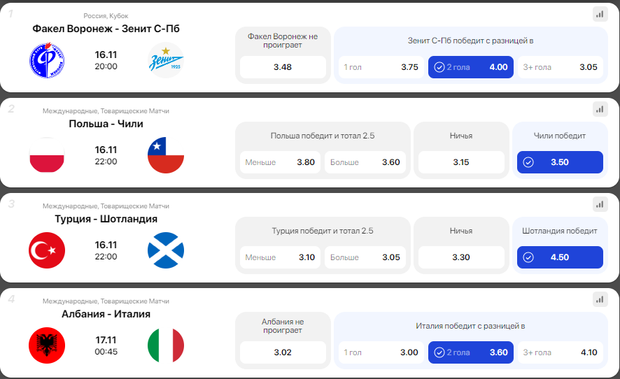 Но, в отличие от привычного тотализатора, игроку может даваться на выбор больше 3 исходов. Например, победа плюс тотал.