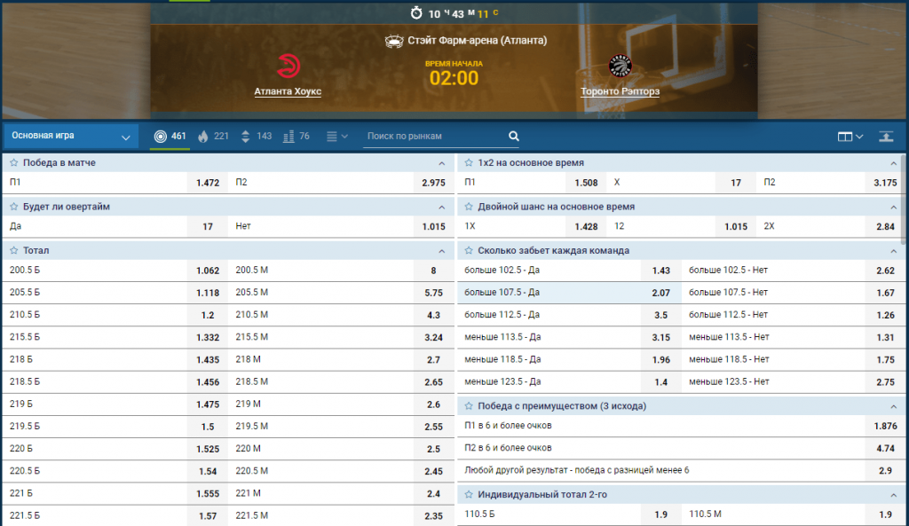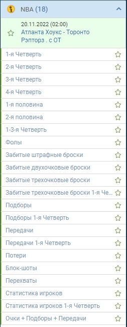 В отдельную линию вынесены статистические показатели: подборы, штрафные, трехочковые броски. Суммарно на матчи NBA букмекер дает более 1000 различных вариантов для ставок.