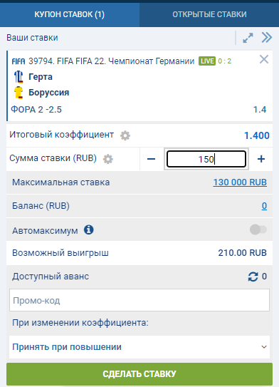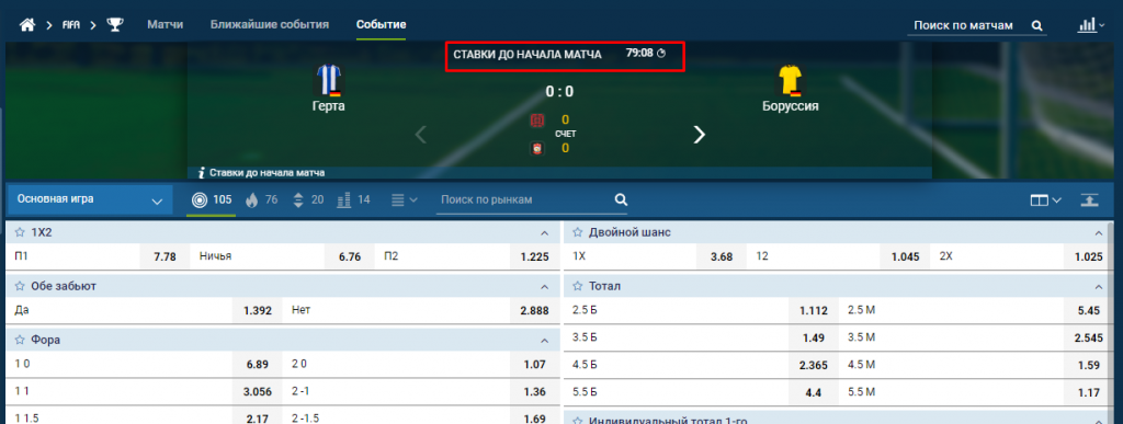 FIFA — очень динамичная игра, котировки меняются быстро. Часто линия закрывается на несколько секунд, после чего происходит значительное изменение коэффициентов. Для ставок на ФИФА в лайве рекомендуется использовать функцию «Ставки в 1 клик».