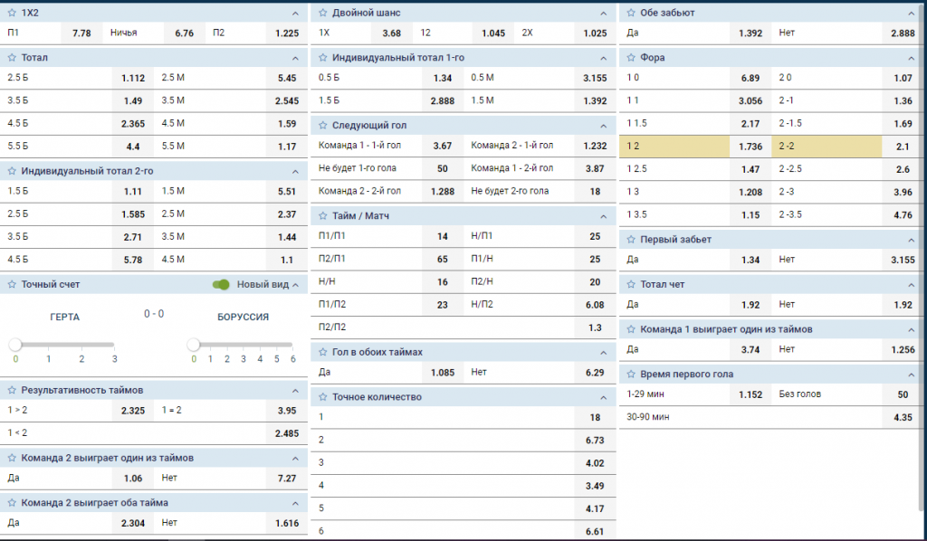 - Исходы. Ставки на результат матча и отдельных таймов. Принимаются ставки на конкретный результат (победа одной из команд или ничья) и двойные исходы.
