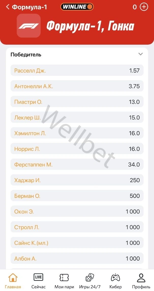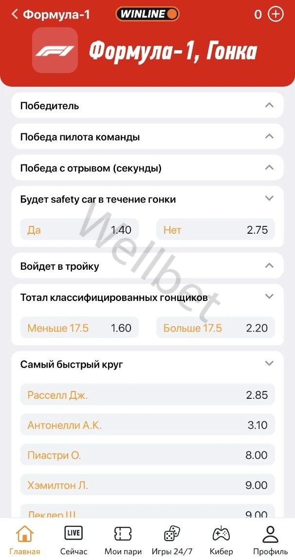 Основная роспись в БК Winline идет на гонку. Представлены следующие типы ставок: