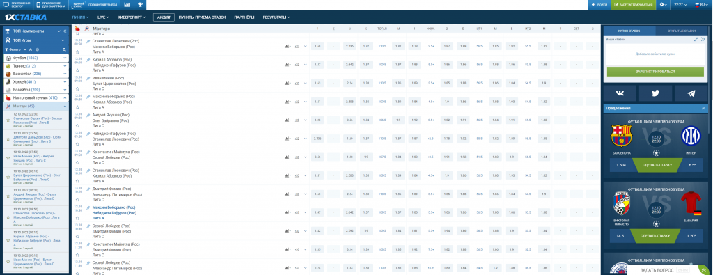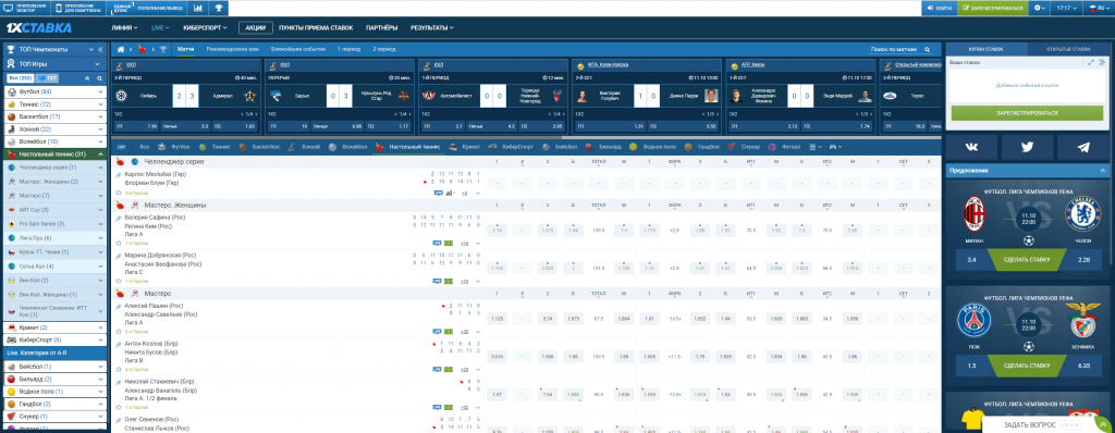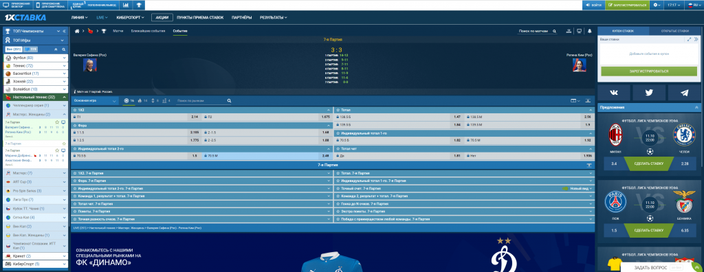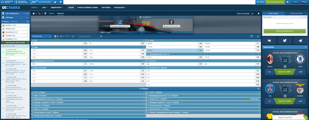 Обзор линии и росписи на настольный теннис в «1хСтавка»