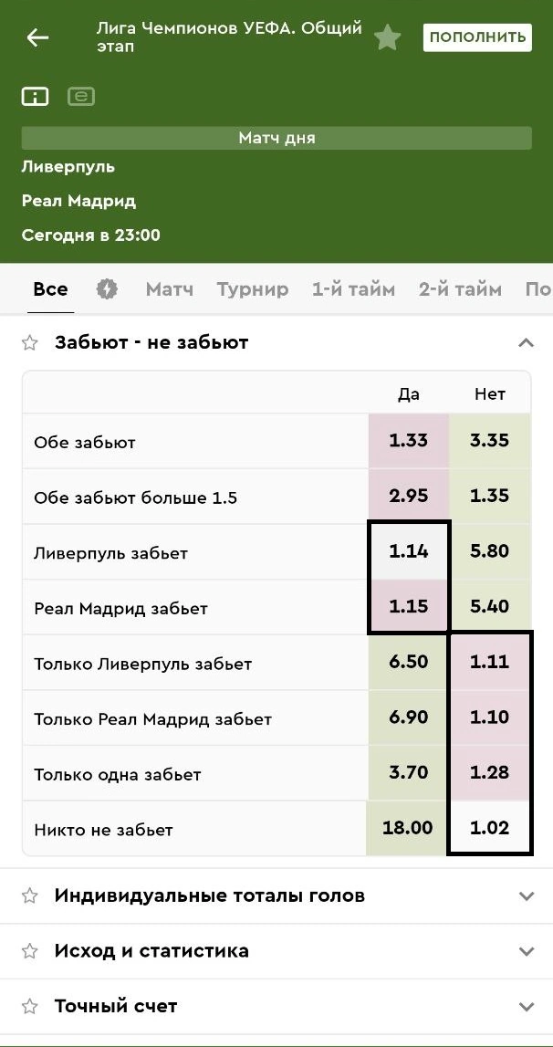 - Ставка на минимальные значения ТБ. Такой вариант допустим, если играют команды с классной атакой и сыплющейся обороной.