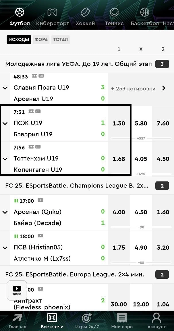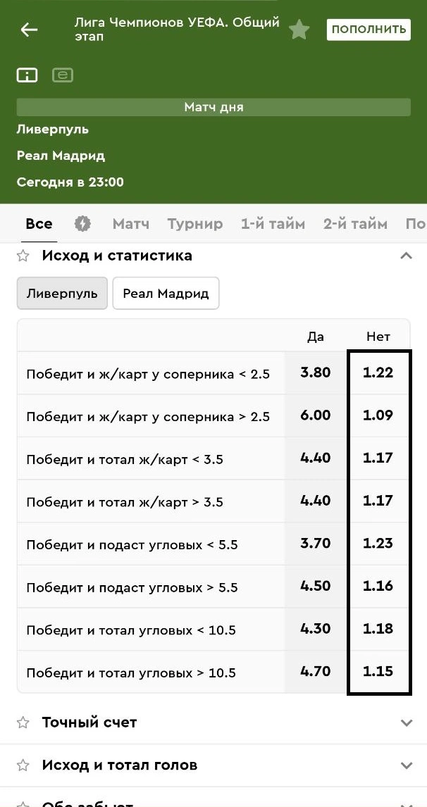 - Правильного подбора вида пари на спорт. Можно использовать только прогнозируемые исходы (1х2, фора, двойной шанс, тотал). Рынок «Исход и статистика» часто имеет котировки из нужного диапазона. Однако случайная составляющая выше. Риски проигрыша растут.