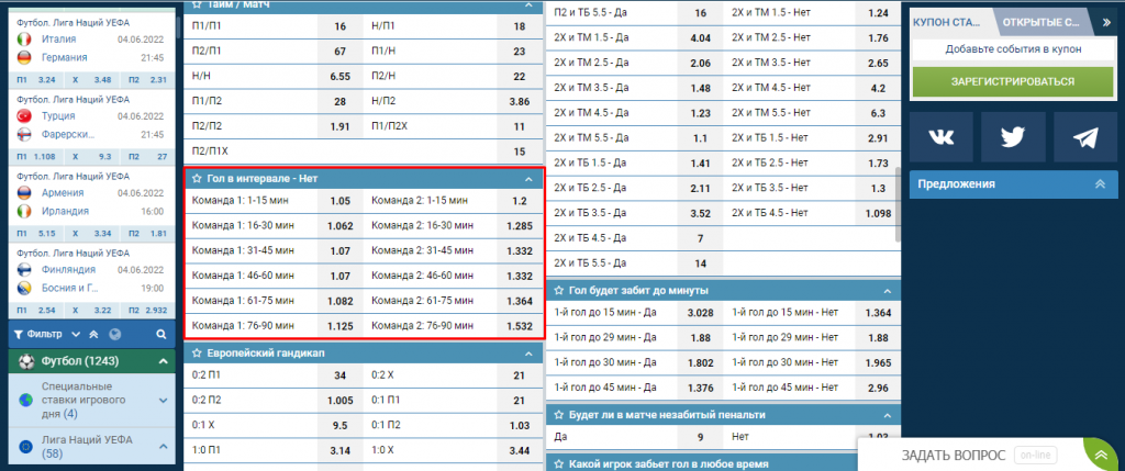 - Правильного подбора вида пари на спорт. Можно использовать только прогнозируемые исходы (1х2, фора, двойной шанс, тотал). Рынок «Гол на минуту: «Да» и «Нет»» часто имеет котировки из нужного диапазона. Однако случайная составляющая выше. Шансы на проигрыш растут.