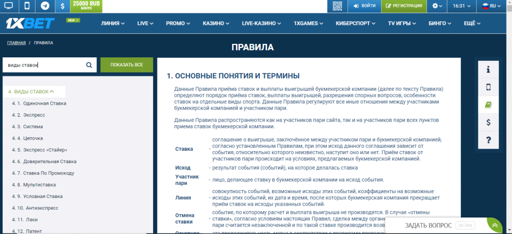 Это только основные виды пари. Подробную информацию о ставках и коэффициентах стоит посмотреть на официальном сайте конторы. Здесь на первой странице ресурса, в подвале, нужно найти раздел «Правила», где открыть пункт № 4 «Виды ставок».