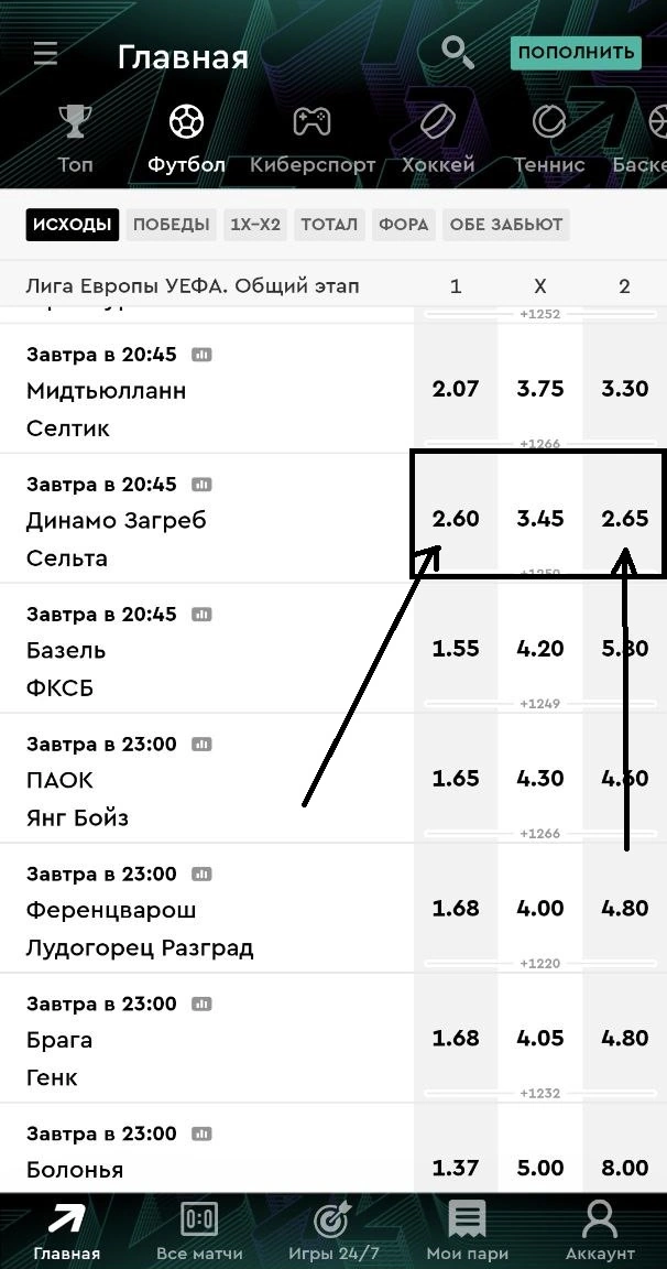 | Тотал больше или меньше | 1.80+ | Разнообразие с возможностью подобрать ТМ/ТБ с оптимальным значением |