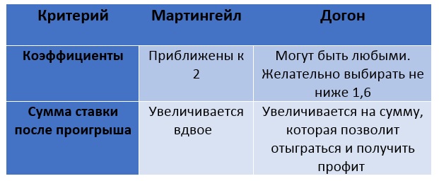Правила догона более гибкие. Мартингейл содержит четкие правила относительно последовательности действий и больше ориентирован на прогнозы с равным шансом.