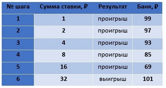 С каждой неудачной ставкой банкролл уменьшается. Выигрыш позволит отыграться и получить профит, равный первой ставке.