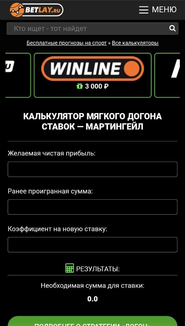 Чтобы не проводить расчеты, можно работать с онлайн-калькулятором. На выигрышной серии размер ставок не повышается. Если прогноз зашел, происходит возврат к первоначальной сумме, равной размеру начального пари.