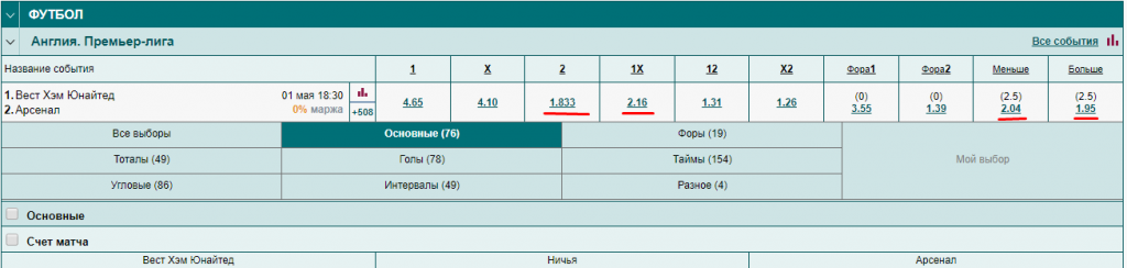Для примера возьмем самый популярный вид спорта — футбол. Матч Между “Вест Хэмом” и “Арсеналом”, который должен пройти 1 мая 2022. Букмекер дает на него следующие котировки.