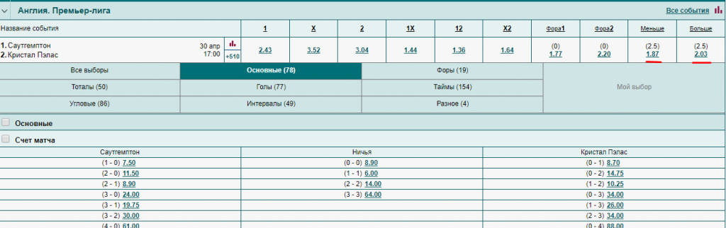 На игру “Саутгемптон” — “Кристал Пэлас” маржа есть. Вероятность на тоталы точно такая же. Однако, коэффициенты уже не влазят в допустимый диапазон. Это значит, что нужно пропускать потенциально выгодные игры или расширять диапазон котировок, что может уменьшить прибыль.